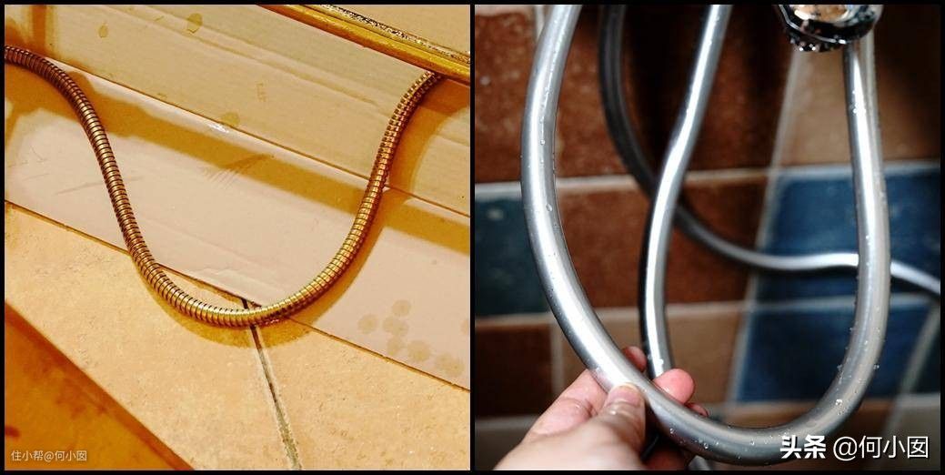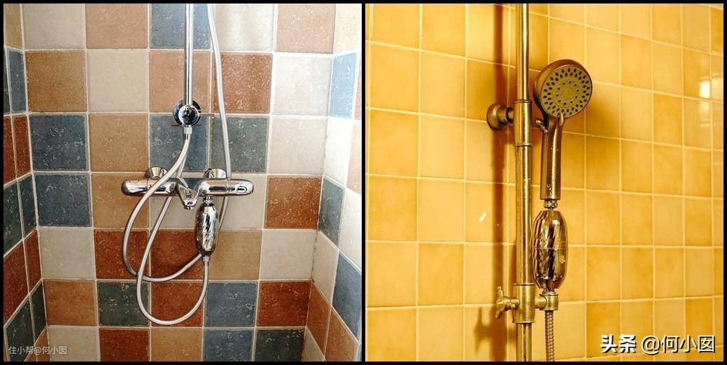 这里提一句,如果你家有这样的过滤器,使用分体式花洒就可以把过滤器接到总出水口这里,顶喷和手持花洒都可以享受过滤器的加成,像下图左边这样,如果是连体的花洒,那就只能把过滤器接到手持花洒上面了,如右图