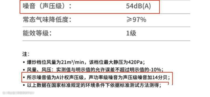 在选购时要着重分清,商家一般会展示声压级的噪音分贝,而我们需要关注的是声功率级噪音(声压级别db+14db),如下图所示。