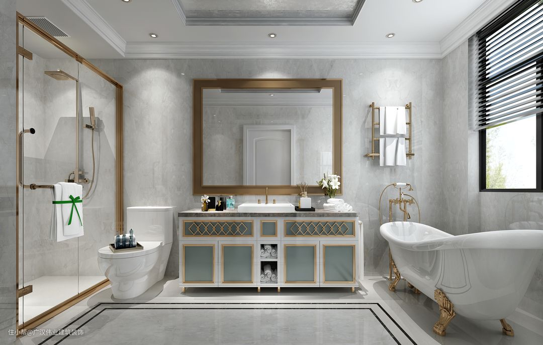 搭配同类色和类似色为宜,如浅灰色的瓷砖、白色的浴缸、奶白色的洗脸台,搭配淡黄色的墙面。