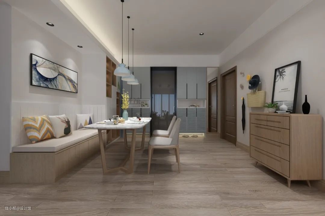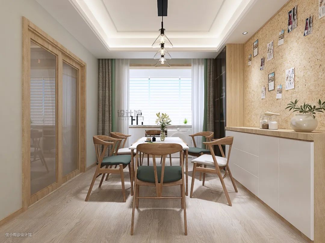 餐边柜作为一件尺寸较大的家具,摆在餐厅的时候,也要考虑空间的整体动线,避免摆下餐边柜就影响入座通行了。根据不同的餐厅户型,可以摆放餐边柜的位置也有较多的选择。