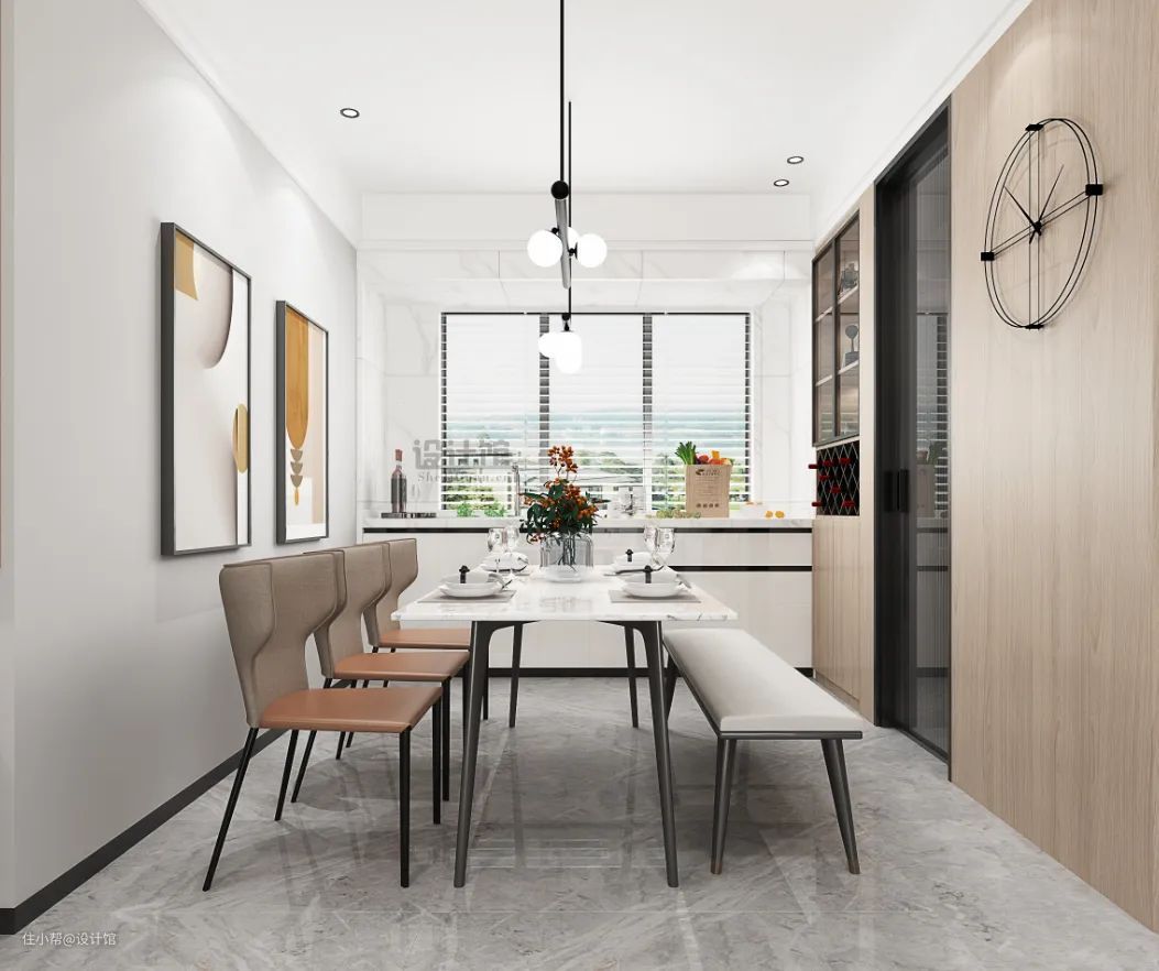 餐边柜上的台面,也是一个非常方便实用的地方,像热水壶、冷水壶、水杯、茶具什么的,都可以摆在这里,腾空餐桌台面,保持餐厅区域的美观效果。