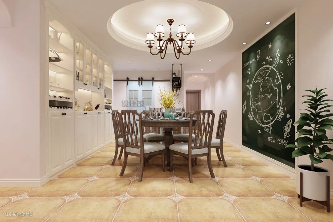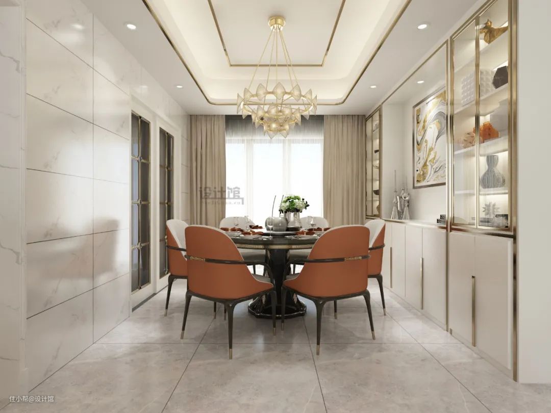 装上餐边柜后,上面可以做一些留空的隔层,这样主人平时收藏的一些艺术品、展示品之类的,就可以摆在餐边柜上了。美观精致的装饰品,也可以提升客餐厅空间的优雅与精致档次。