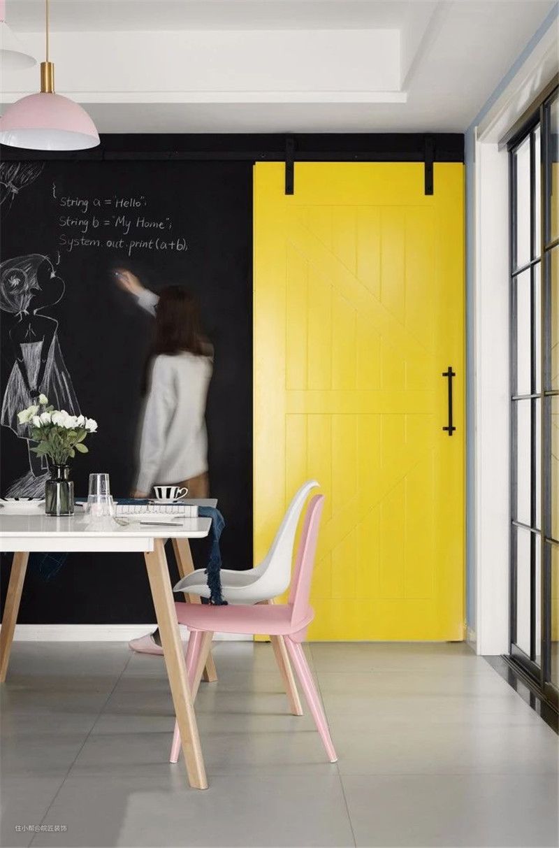 厨房,选择颜值高且不占空间的谷仓门,明黄色设计增加层次感。内部以白色为主基调,搭配黑色的台面,干净整洁易清理。
