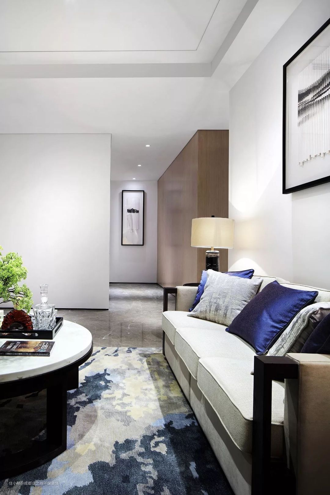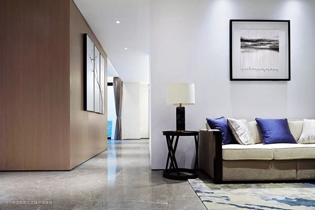 空间的整体视觉以白色、木色、暖灰色为主调,辅以一些清透,灵动的山水画点缀其中,体现现代中式中的含蓄之美。化繁为简,注重细节及比例美感,强调合理空间布局与使功能完美结合。