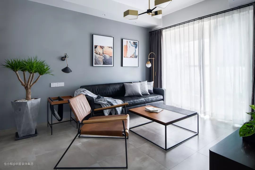 ▲客厅以水泥灰质感的地砖,搭配灰色调的墙面,布置上黑色皮沙发,还有橙色沙发椅,营造出一个简约舒适而有活力轻松的年轻氛围。