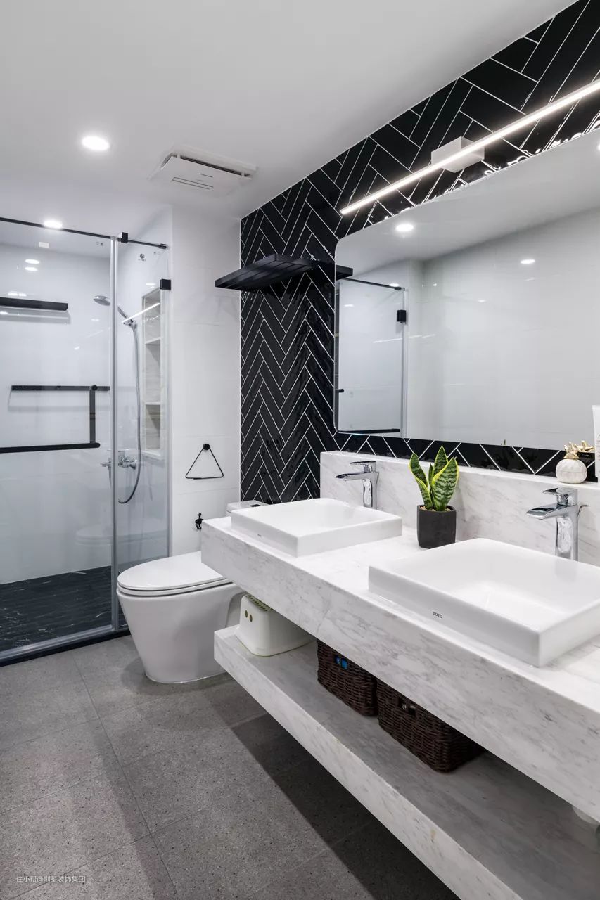 ▲卫生间在黑白灰的主调下,墙面以黑色小格砖做成人字铺拼接设计,搭配大理石质感的双人洗手盆,淋浴房的墙面还装了壁龛收纳,整体空间设计时尚而又优雅大方。