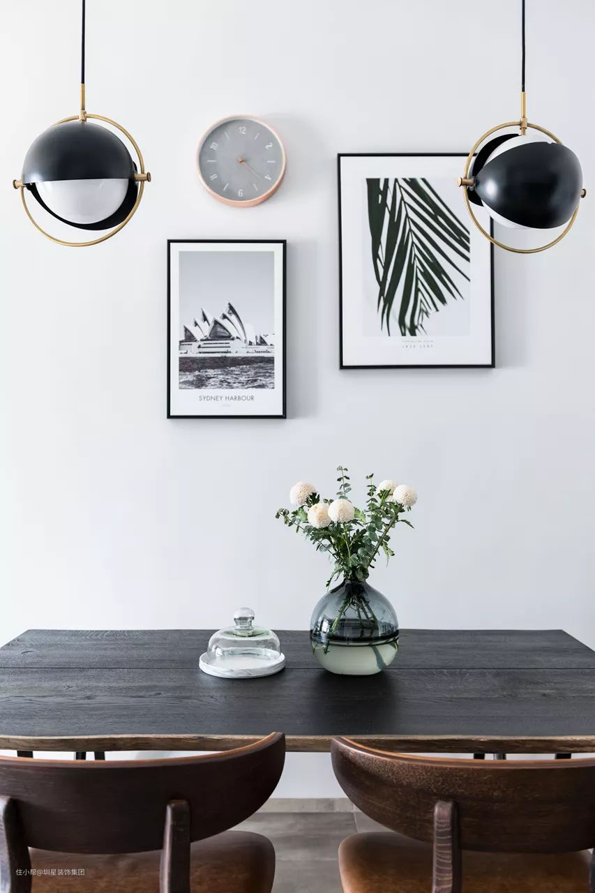▲餐厅背景墙上挂着极简的黑框画与一个木质圆形时钟,搭配两盏独特造型的黑白配球形吊灯,餐桌台面上的花瓶布置,仿古调的皮质餐椅,带来的是一个温馨浪漫的用餐氛围感。