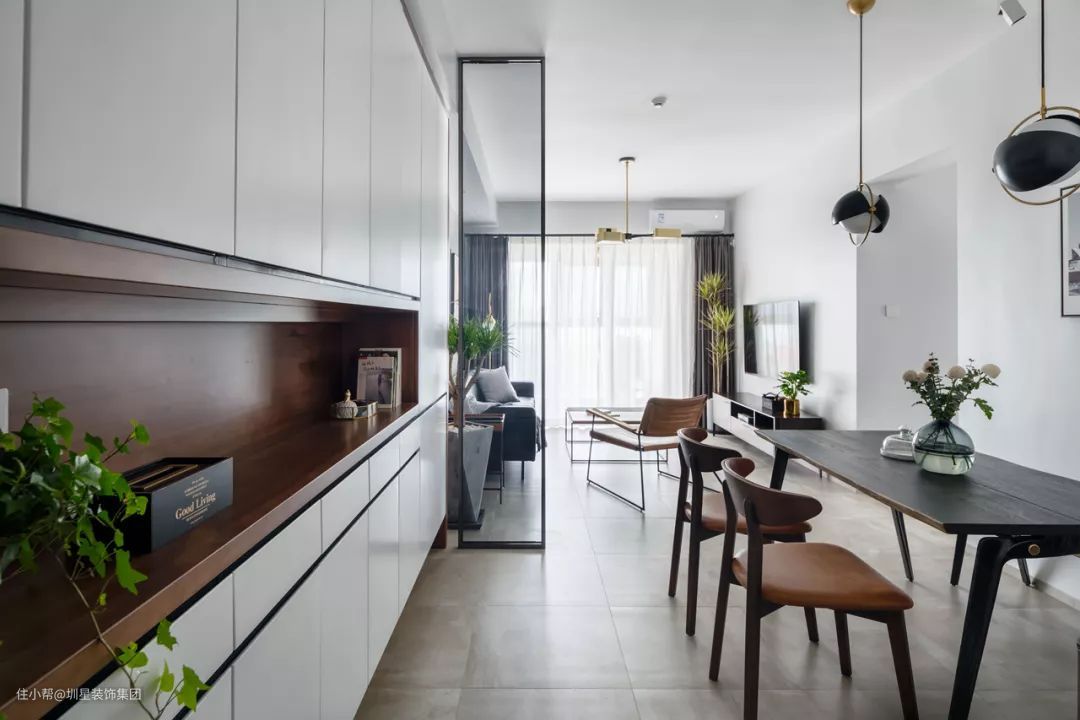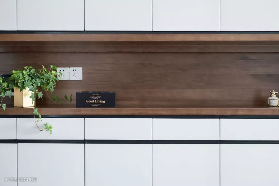 ▲一旁的柜体加入了黑色的拉手线条,中间留空一层加入木质的格架层,摆上绿植与小饰品,带来一个层次丰满又温馨的气质感。
