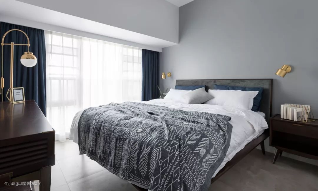 ▲卧室在灰色调的氛围下,搭配实木床与素白床单,点缀上金色的灯具,显得简洁轻奢有档次。
