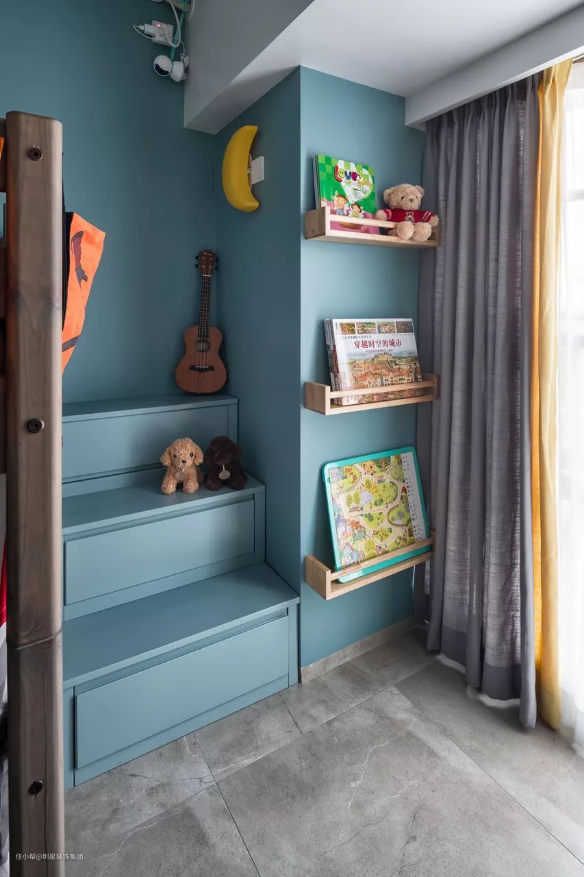 ▲靠窗的床尾位置是通往上架床的收纳楼梯,搭配上鲜艳的黄色、蓝色等的细节,再搭配上可爱的小饰品,呈现出童趣温馨的氛围感