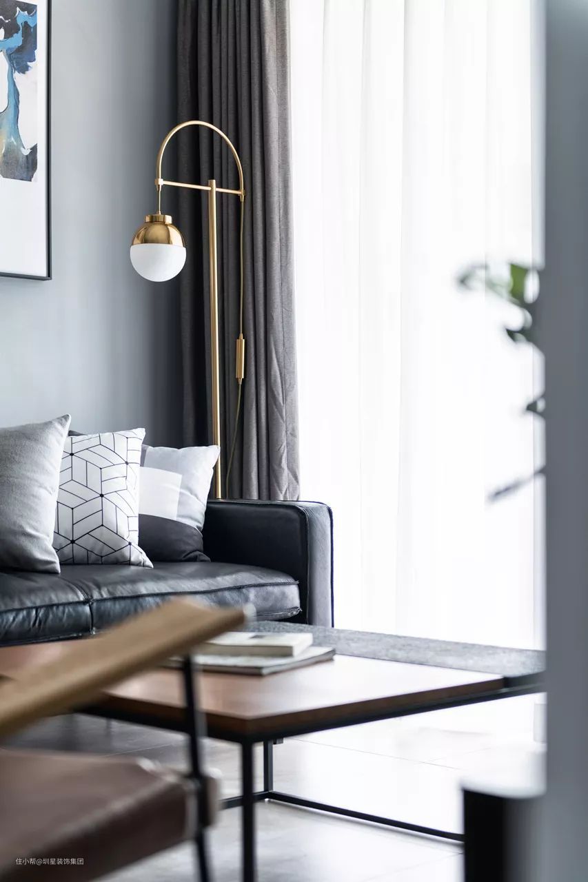 ▲客厅沙发旁的靠窗位置,还有一盏铜艺质感的落地灯,为空间带来了轻奢华丽的气质。