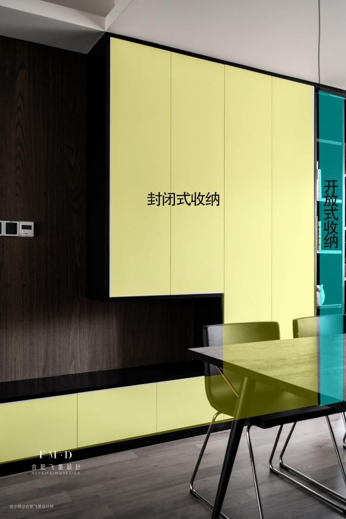 ②也可以是下面这种,直接延伸出卡座,旁边餐边柜顶天立地,收纳空间也能倍增,为了方便置物,也可以将局部留空一排做开放式收纳,同时增加整体空间层次感和美感。