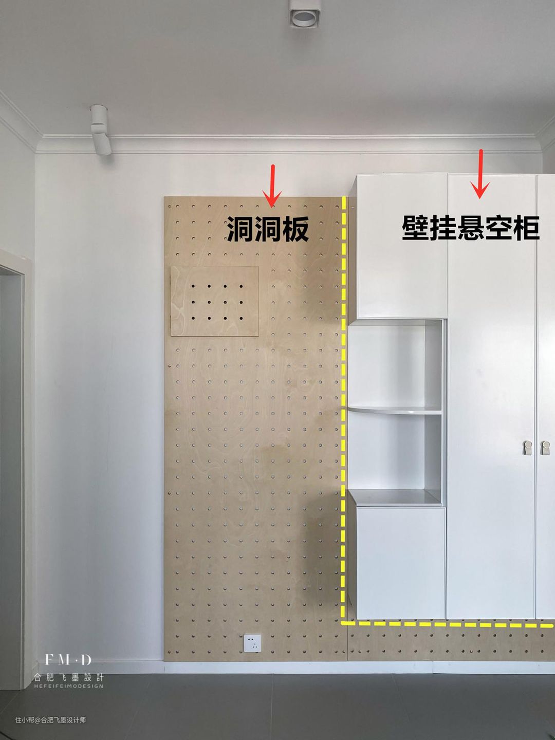 入户门靠墙比较窄,不能直接打柜子的情况,是不是也有很多人发愁?其实用这种过渡的方法就可以了,靠门的位置,沿墙面铺洞洞板,不占用空间也能增加收纳,这家在设计的同时还一并将电表箱给隐藏了起来。然后到室内稍微宽敞一点的空间后,连着洞洞板再打上壁挂悬空柜,悬空收纳进出换鞋都可以!