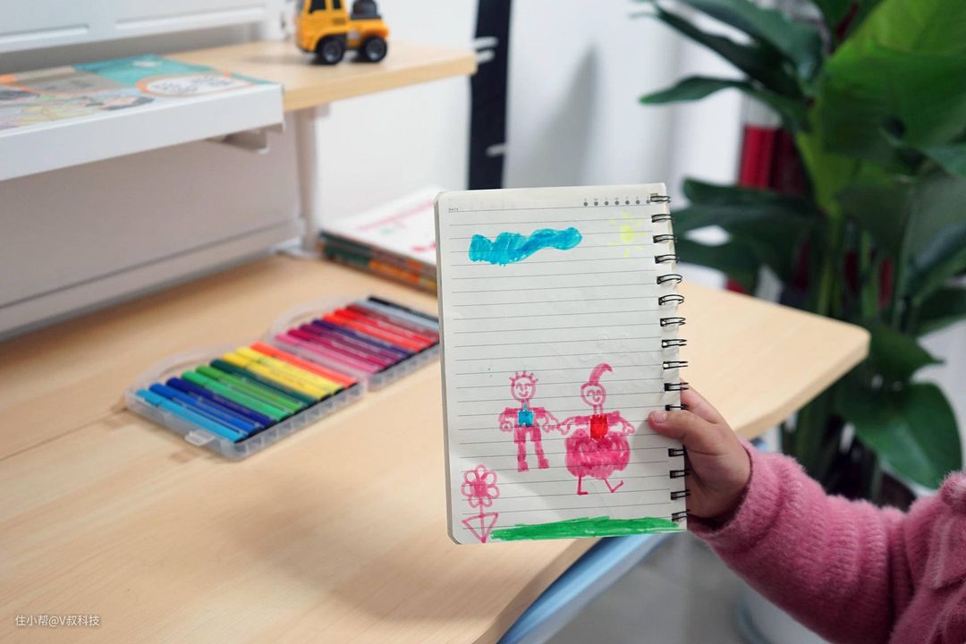 从安装好这个升降桌,孩子就迫不及待要使用了,除了放置书本,铅笔和一些学习工具外,还可以放置像绘画笔盒之类的物品。当笔者下楼一会的功夫,小丫头竟然就画好了一幅画,看着孩子这样自由发挥,笔者心里是挺高兴的!