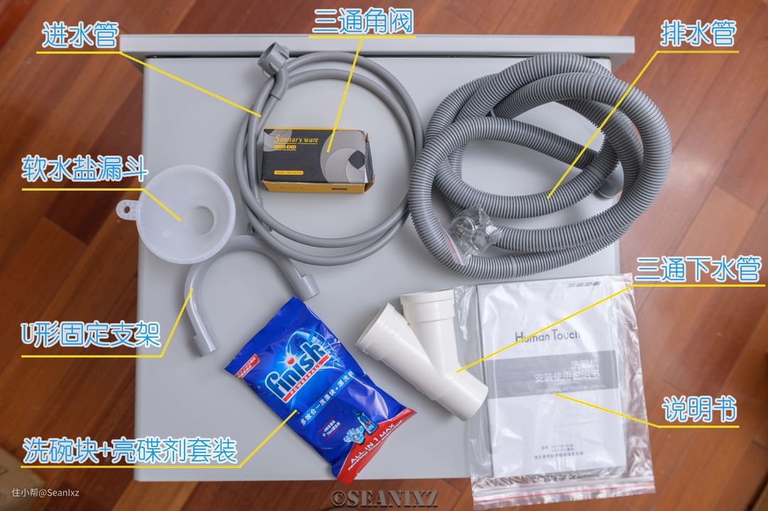 随机附件:排水管、进水管、软水盐漏斗、U形固定支架、三通角阀、三通下水管、说明书,附赠了一套多效洗碗块+漂洗剂套装。