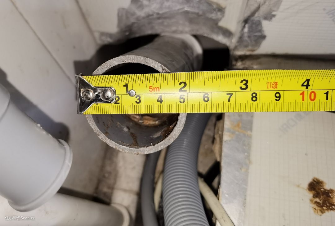 量了下尺寸才知道,这个排水管还有问题,壁厚比普通的要厚一点,标配的φ50mm 三通插不进去。