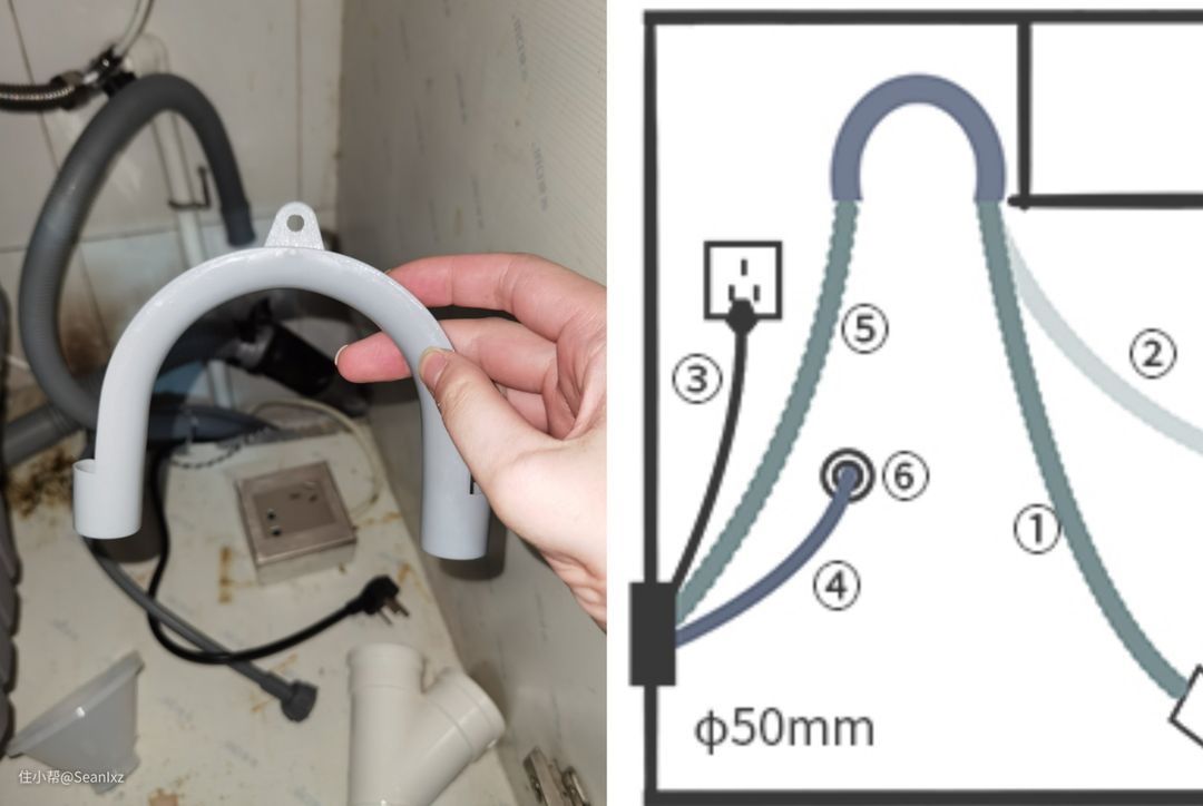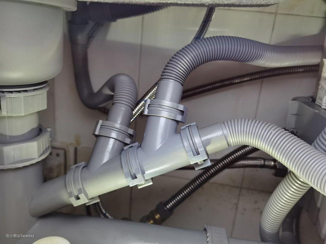 要注意一定要让排水管走这么一段U形回路,位置要稍高一点,主要目的是为了存住一定量的水,让洗碗机的排水泵正常工作,避免空转,也同样防止下水道的蟑螂沿着空的管线爬进洗碗机。