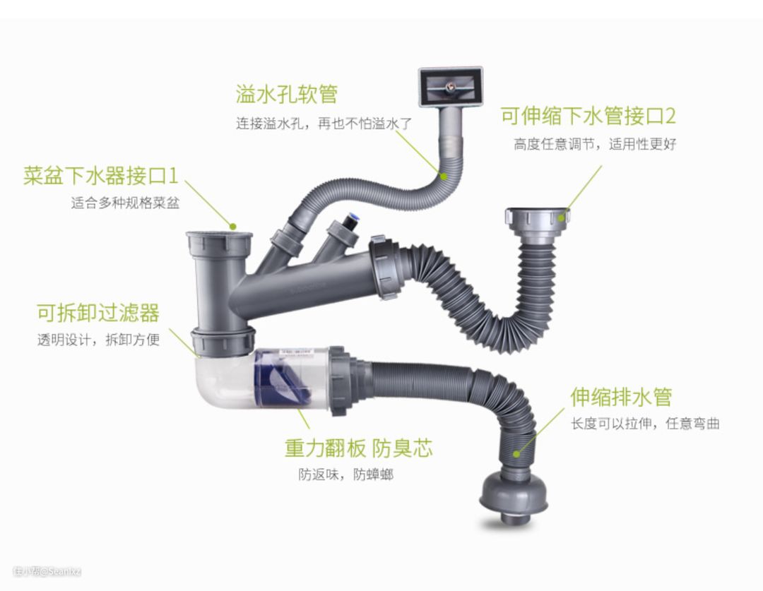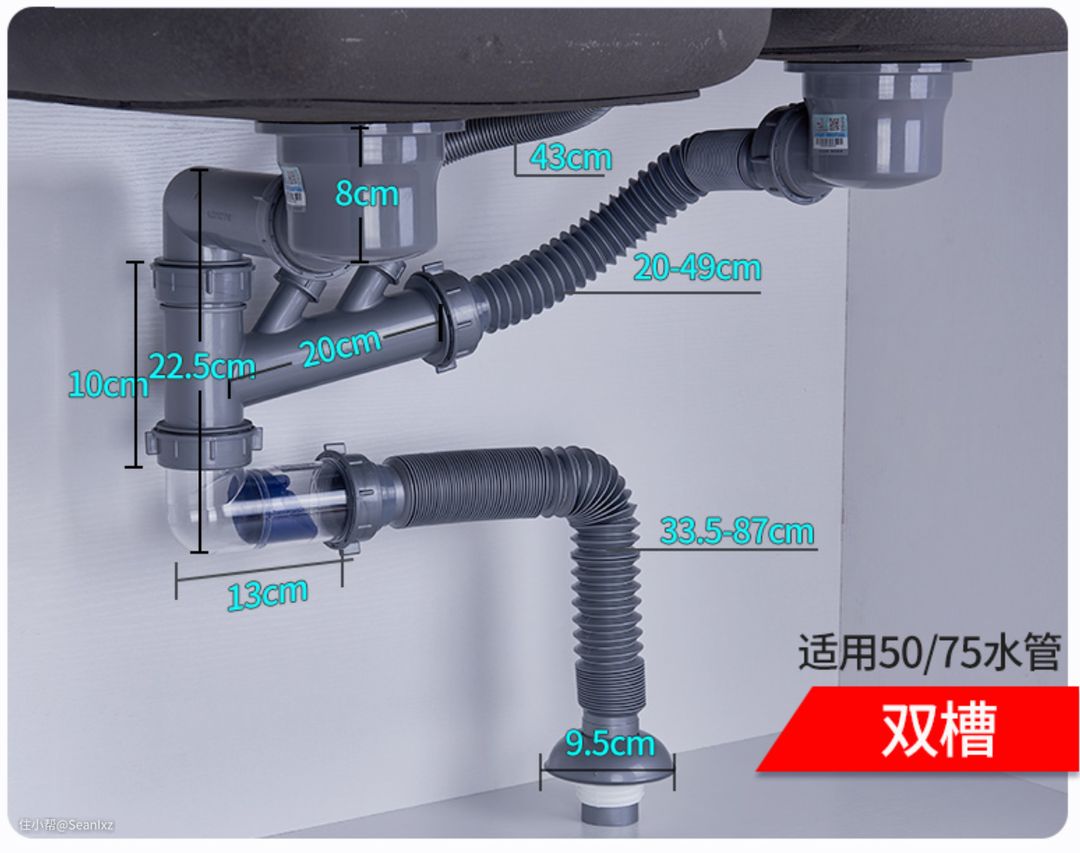 另外比较推荐这样的贴墙款下水,水槽下的空间也可以利用最大化,日常水槽下的空间都是塞满了米面粮油之类的物资的。