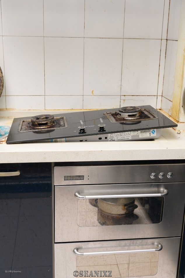 揭开陈年的燃气灶一看,下面空间还是足够的,消毒柜背部还有一定的空间,可以穿燃气管,消毒柜和洗碗机的外形尺寸基本一致,背部的空间也是足够穿进水管、排水管、电源线的。