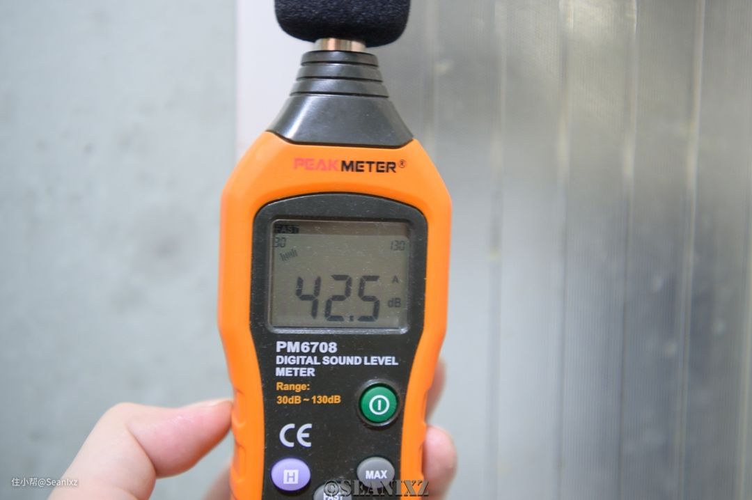 实在介意噪音影响的话,厨房一般带个隔断门,关上门在门口测试,42.5dB,一道门让噪音水平大幅减弱了,基本可以忽略不计。