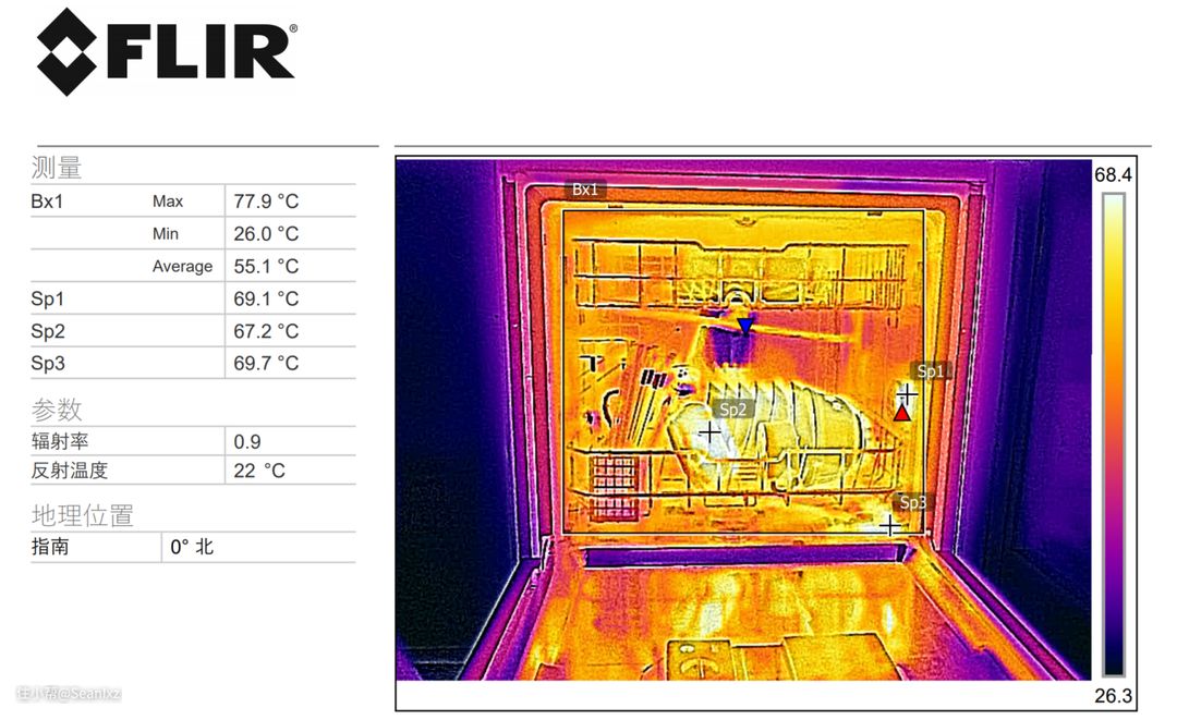 程序结束后使用红外温度测试仪拍了一张内部温度分布照片,碗的表面基本维持在接近70℃的较高温度,最高点出现在热风出风口位置,表明结束阶段热风烘干也同时在工作,可以把高温水汽排出,减少内部冷凝水量。