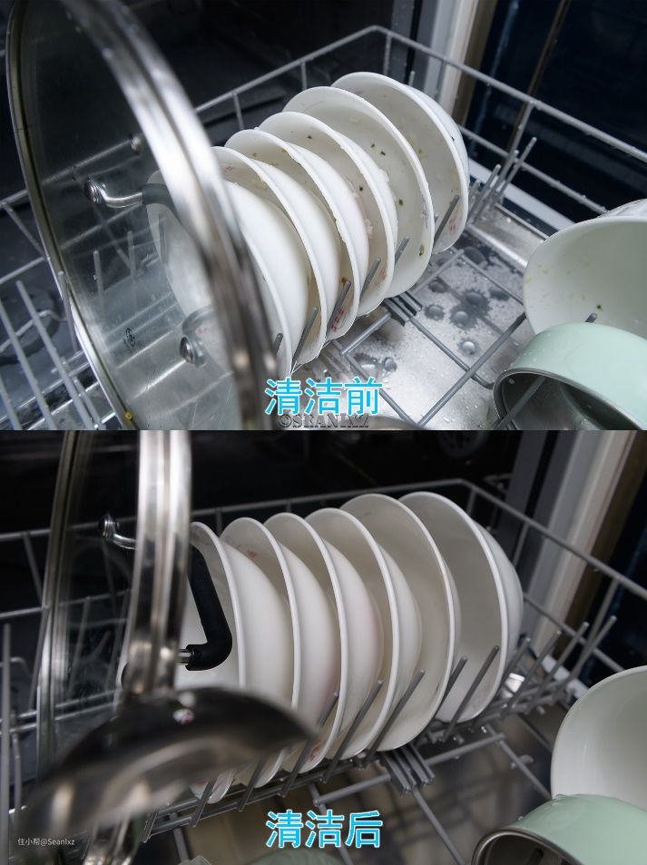 再来看看清洁效果对比,一款洗碗机核心的部分就是清洁能力了,这里使用智能洗程序测试了不同材质和污垢下的清洁能力。