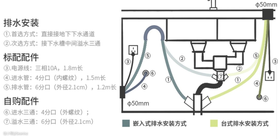 排水管的首选是放进总下水的三通,洗碗机排水管直接进入下水。