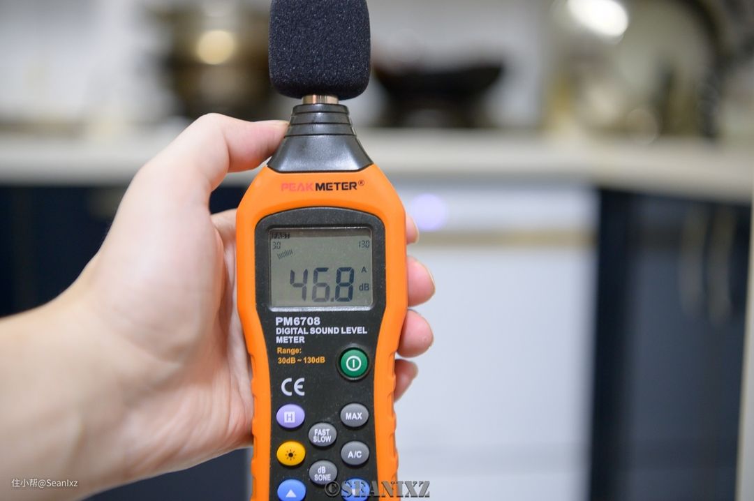 按照国标规定的1m左右距离再次测试噪音水平,46.8dB,还算可以接受,毕竟非实验室条件,噪音是会叠加的。