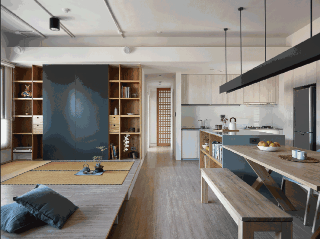 客厅中用榻榻米代替沙发的方式也不少见,在榻榻米上放上蒲团和靠垫来代替客厅中的沙发,客厅会变得与众不同,尤其是有孩子的家庭,在榻榻米上随意打滚撒欢,别提有多开心了,在榻榻米上放个小茶几,平日里有好友到访,品茶、聊天、对弈,承担着休闲茶室的功能,如果有客人要留宿,榻榻米还可以当客房使用。