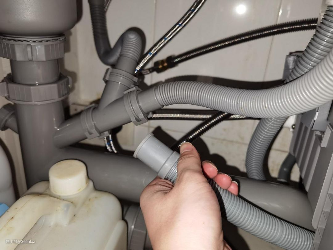 要注意一定要让排水管走这么一段U形回路,位置要稍高一点,主要目的是为了存住一定量的水,让洗碗机的排水泵正常工作,避免空转,也同样防止下水道的蟑螂沿着空的管线爬进洗碗机。