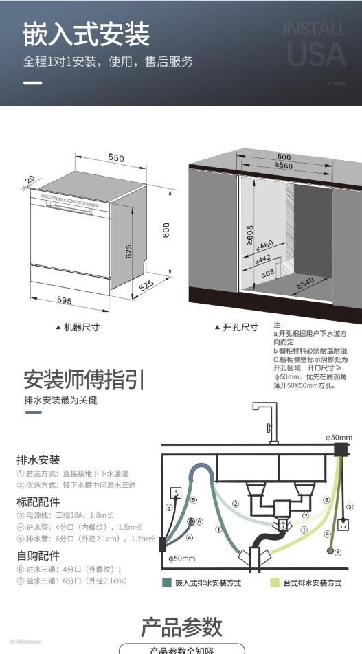 洗碗机的产品界面一般都会标注详细的安装尺寸和安装方式,直观明了。