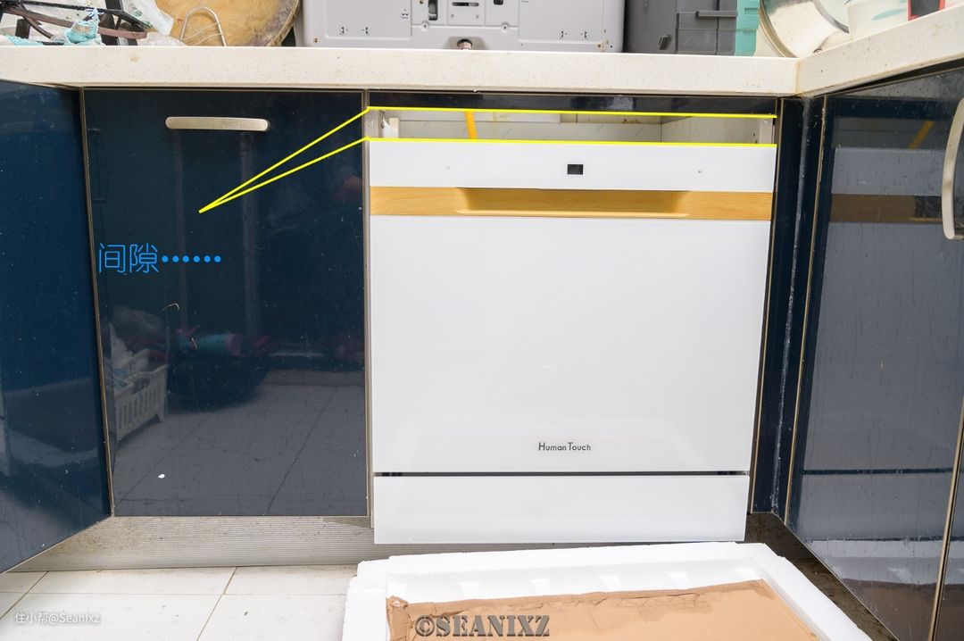 垫两块差不多了,洗碗机底部有四个可以旋转调节高度的脚来补齐高度,这里没有直接装到顶,因为考虑到了果燃气泄漏内部浓度升高到危险值的情况,上部留了点空隙用作通风,毕竟安全第一。
