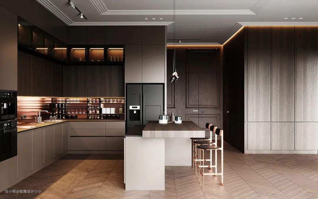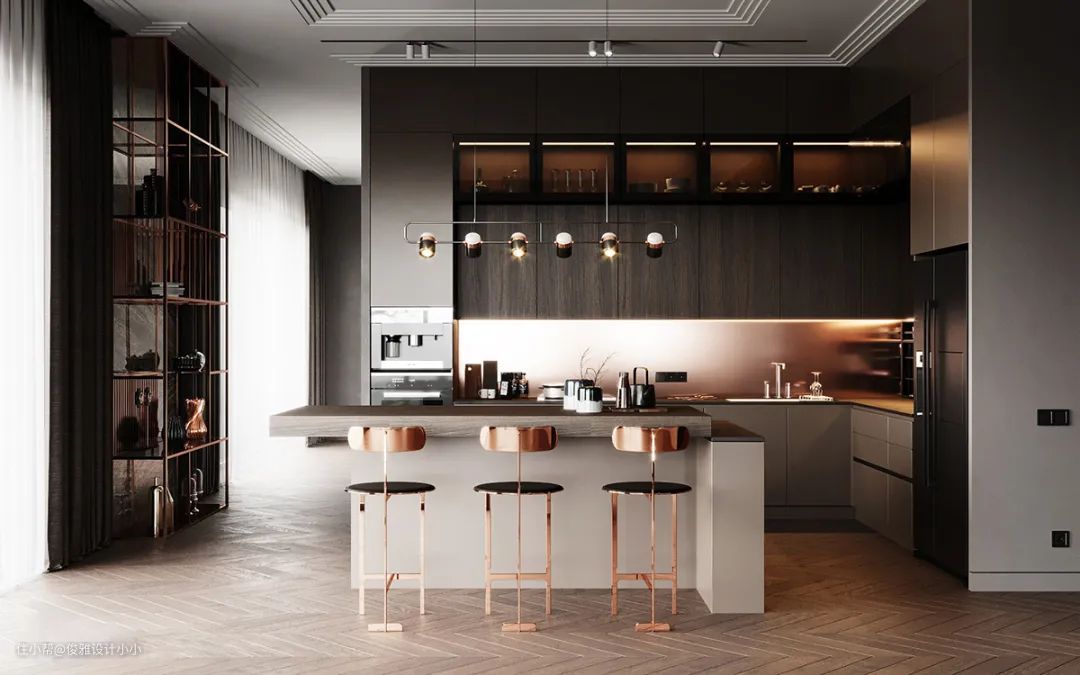 ▲厨房延续客厅的轻奢简约风格,简洁大气的设计手法,没有浮夸的造型,没有丰富的色彩叠加,注重品质与设计感,精心的材质搭配,考究的烹饪用具,无疑体现了对生活品质的追求,所有微乎其微的细节处理都流露出精致的生活情调。