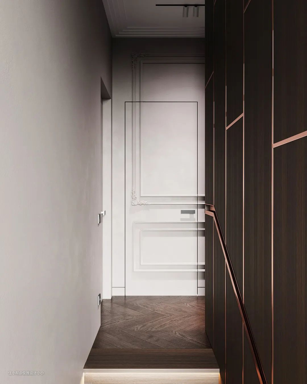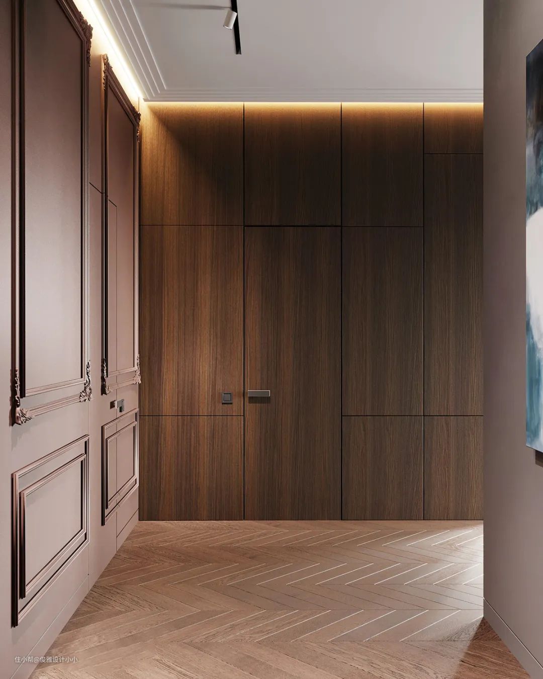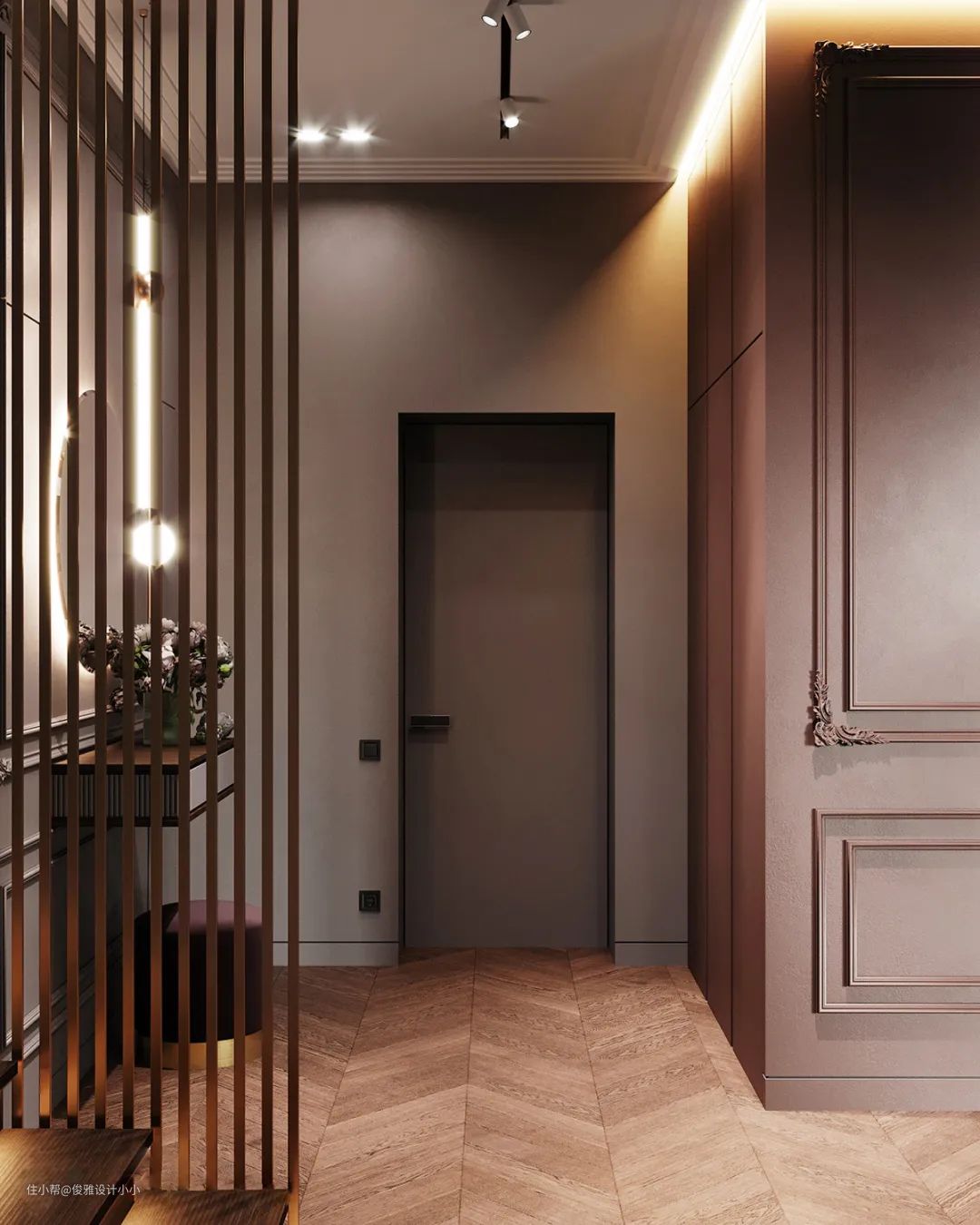 ▲玄关和廊道在视觉感上舍弃张扬,通过对线条及色块灵活应用,以及线性暖光灯饰的点缀,营造出温馨闲适且轻松的空间氛围,呈现低调且奢华,时尚且实用的新风尚。
