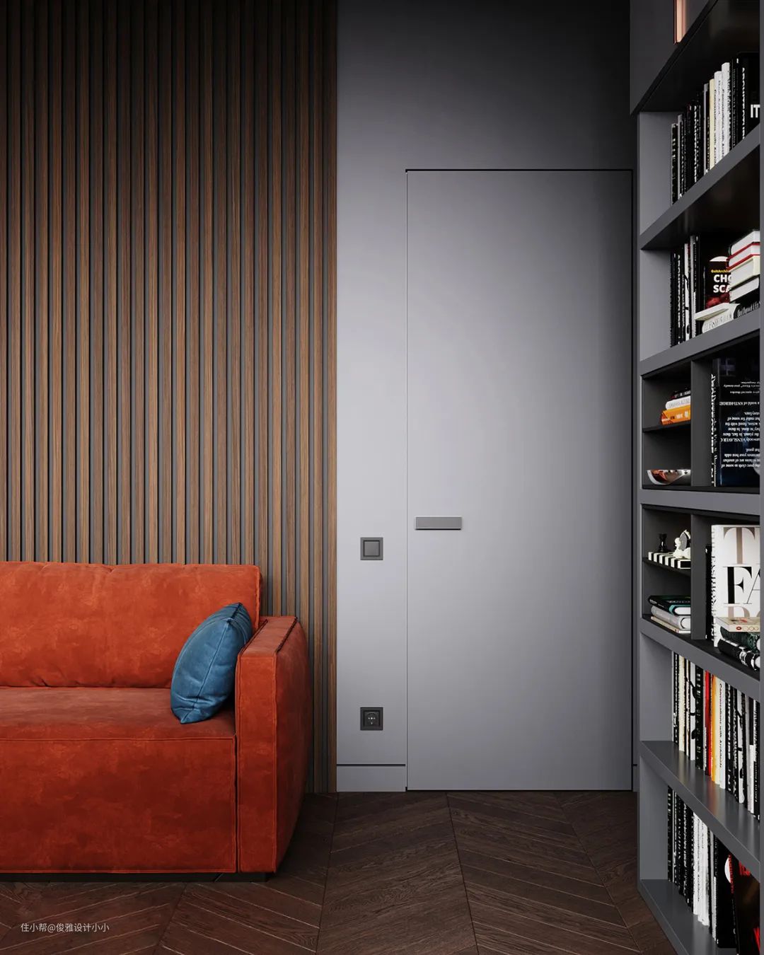▲书房设计采用温润自然的木饰面,木质与生俱来的朴素气质,在空间恰到好处地运用,使简约的空间设计营造出奢华之感,爱马仕橙沙发的选用也突出了轻奢的特点。