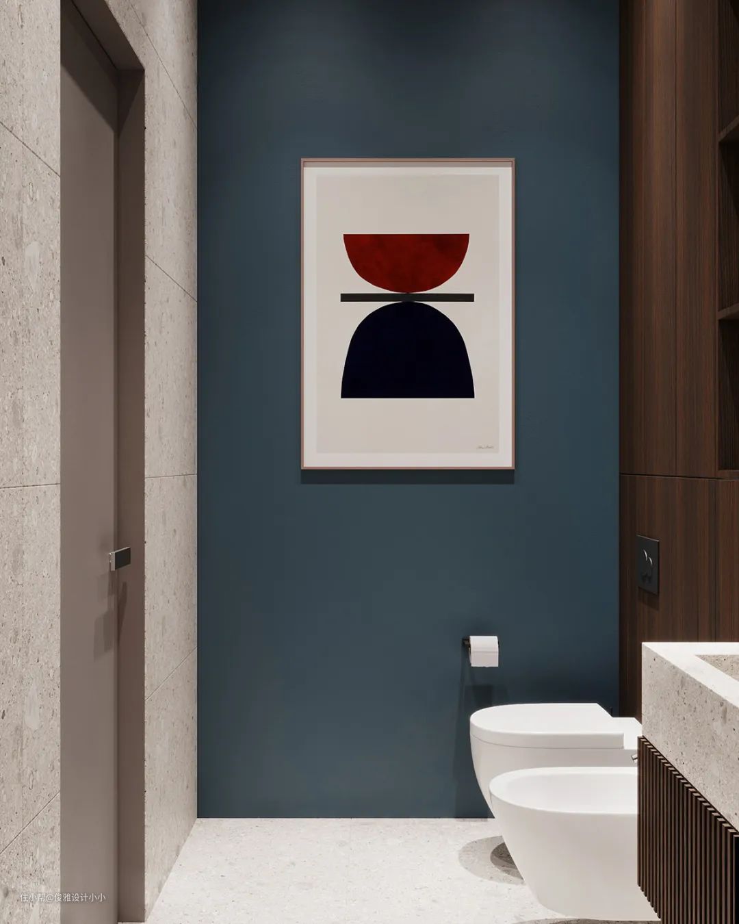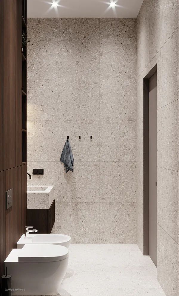 ▲卫浴间典型的现代简约风格,温润木纹搭配冰冷大理石,看似违和实则统一和谐,材质的选择也是功能区的划分,装饰画的选择也是对整体家居色彩的呼应,所以细节都是对生活的致敬。