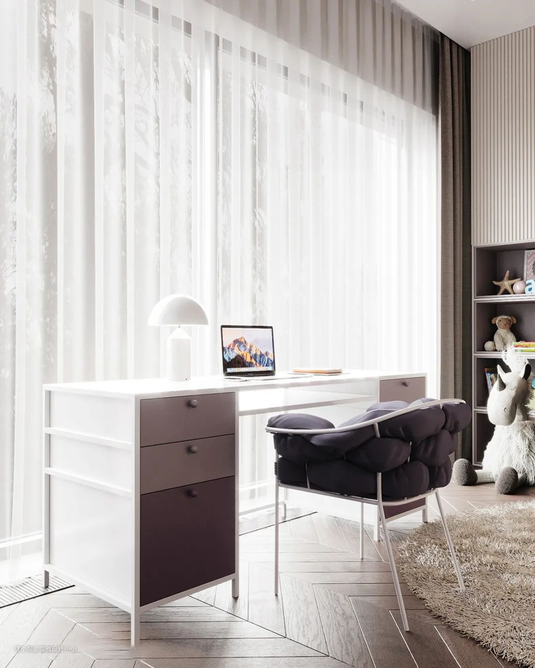 ▲次卧打造甜馨的儿童房,高级的紫灰色与白色搭配,浪漫简约,搭配卡通沙发陈设及玩偶的装饰,营造出活泼且静怡,舒适且雅致、通透且清澈的空间氛围。
