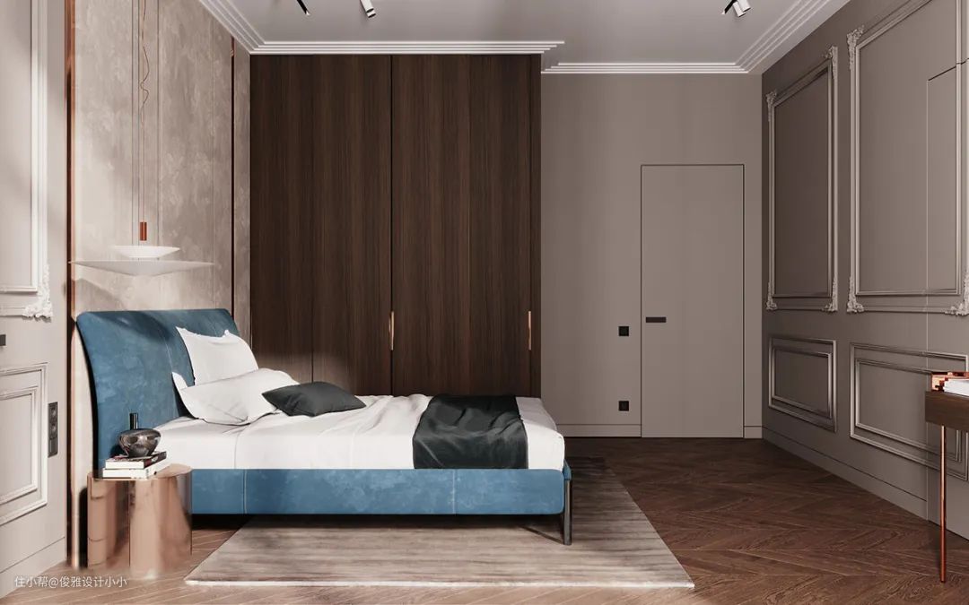 ▲卧室空间设计简洁而不随意,高级却不浮夸,摒弃繁复的造型和丰富色彩搭配,高级灰的空间添入一抹蓝,给人带来轻松舒适、温馨大气的感觉,简约的石膏线装饰搭配金属材质家居陈设,每一个看似简单的设计背后,让人在视觉和心灵上享受到双重的震撼,亦是一种极致优雅生活态度的表现。