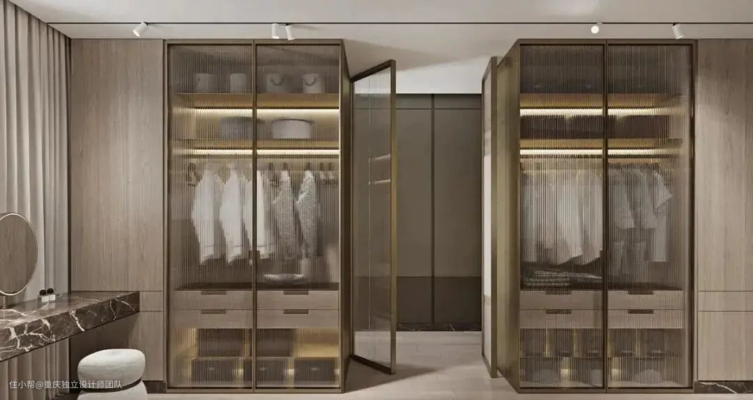 置于各类柜体中的长虹玻璃,磨砂的质感、竖形的纹路赋予其独特的艺术气息。