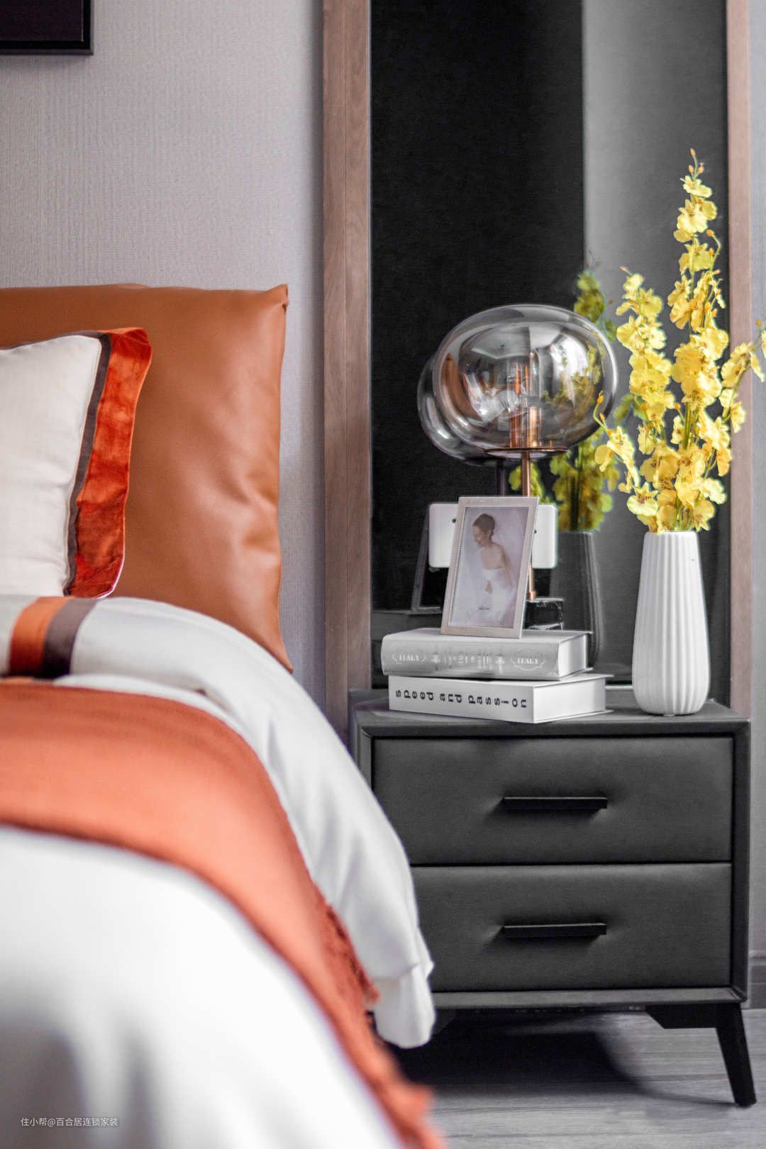 主卧的摆设颇费心思,几何元素的现代地毯,局部橙色搭配灰色墙面的沉稳,绒布的搭巾与皮质的床头结合碰撞出高级质感。更多平常的日子就如同配色本身一样朴实无华,如同岁月一样不露声色,只守着一份心的宁静和知足。