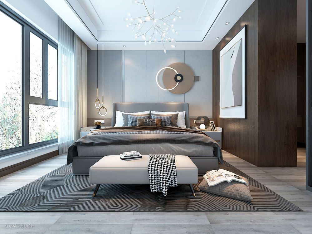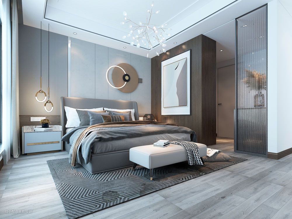 主卧体现现代感与温馨的氛围,柔美的吊灯,抽象主义的裸色画,体现主人的艺术品味;人的一生三分之一都在睡眠中度过,所以家里卧室、床的舒适度就显得至关重要了。主卧室拥有超大的落地窗,这样就更加地为卧室里面提高了档次和品味。