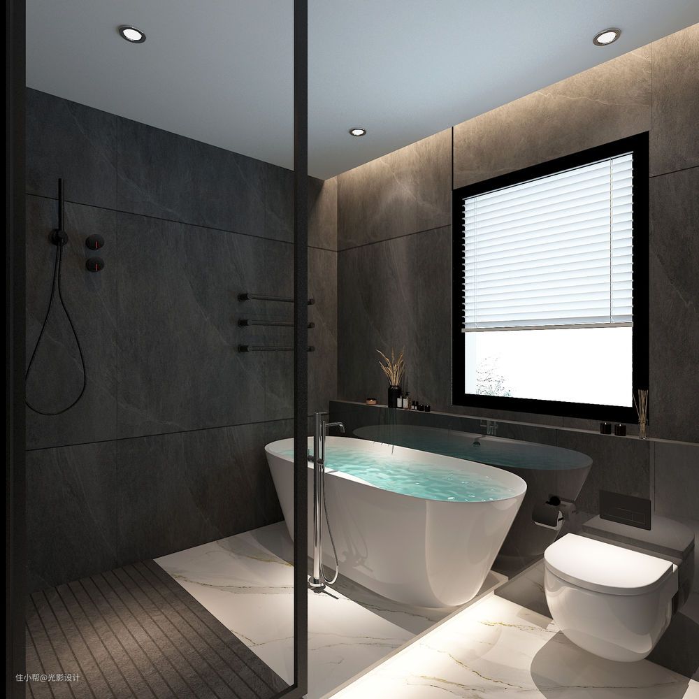 公卫洗漱间干湿分离,淋浴区设置抬高,更好地区分区域,沐浴也成为一种享受;一般都是把鱼缸放在主卫里面,因为业主两个人还没有结婚,也就没有小孩,每天都是过二人世界,所以把浴缸选择放在了公卫里面,让全屋都充满了浪漫的氛围。