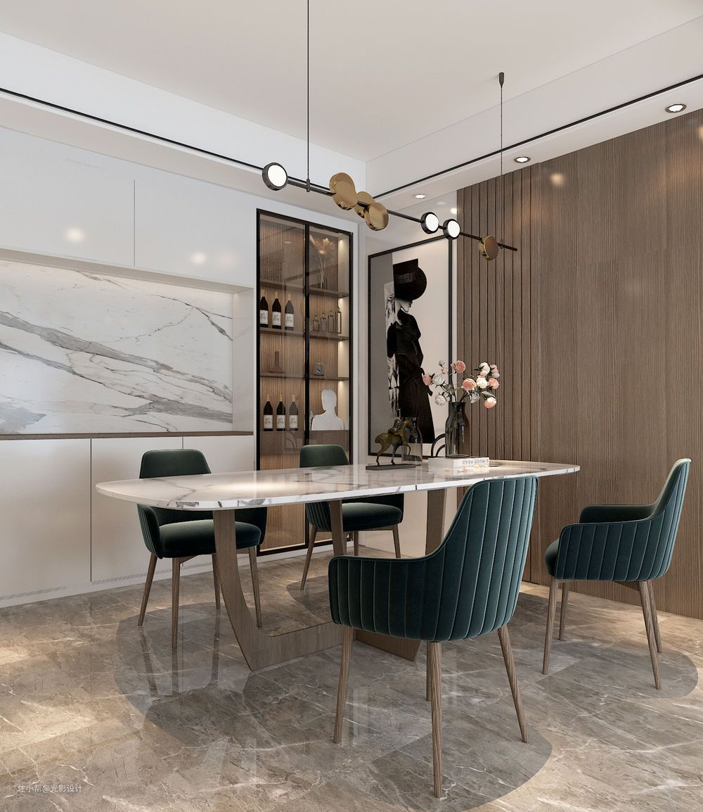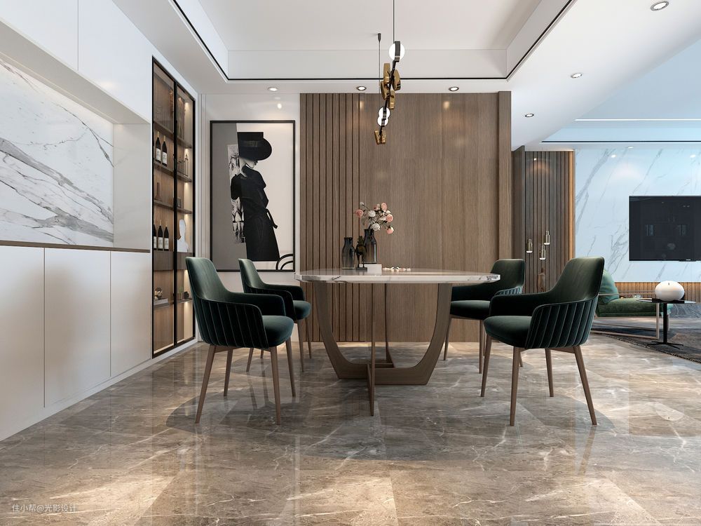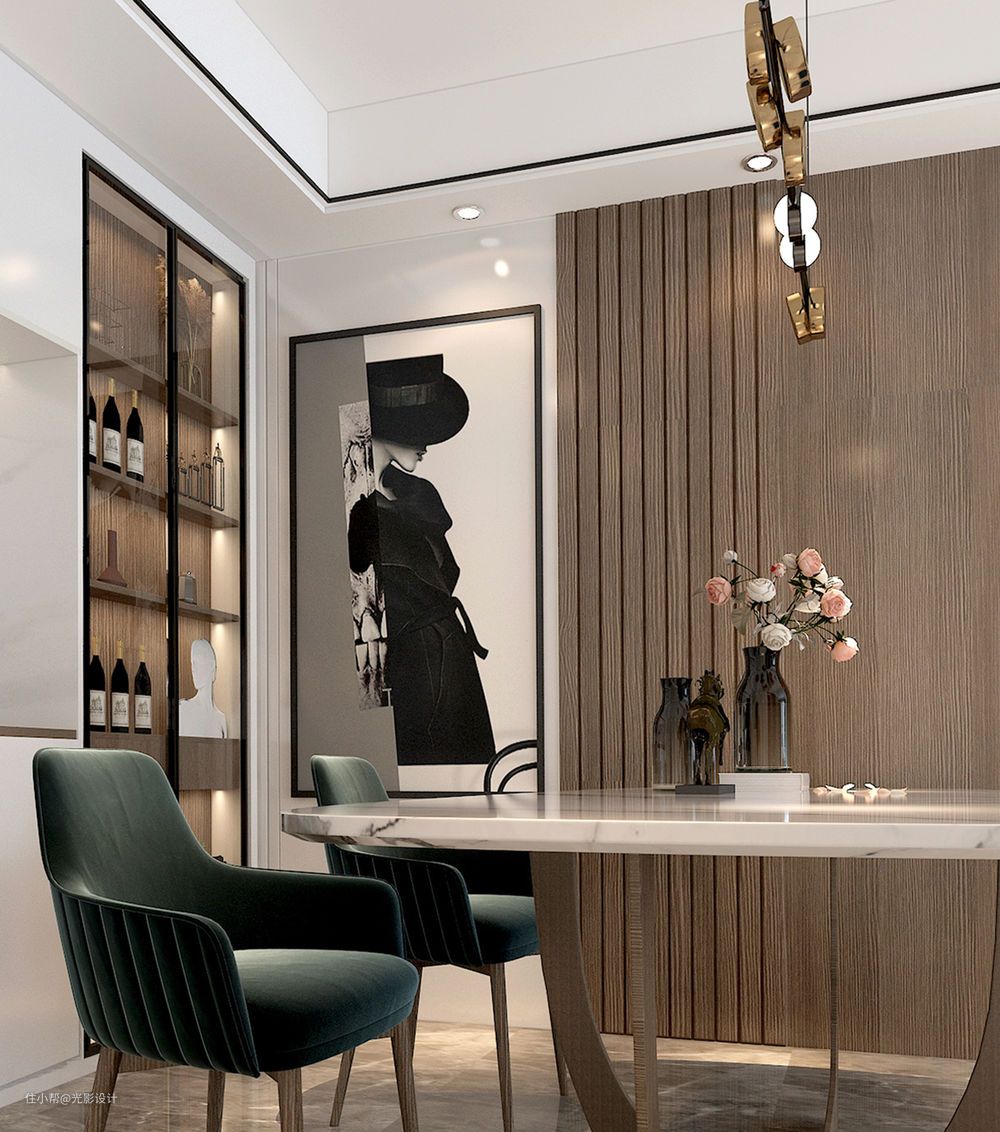 餐厅依靠墙面做整面酒柜,带灯的黑框玻璃柜门与石材的搭配更能体现现代感;餐厅与客厅是连通的空间,酝酿出了更加开阔的视野延伸,这种开阔能更好地获得生活里面情绪的释放,也能让本身不大的餐厅空间得到更大的视觉开阔感;一日三餐,从山野里的美味食材延伸至这里,唤起的美妙情感是对空间的诚恳回应。