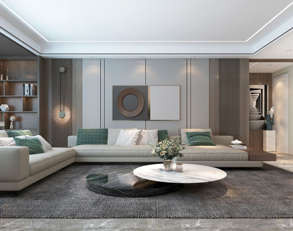 客厅与休闲阳台相连接,视觉增加开间宽度,舒适柔软的转角沙发,清新的颜色搭配木质墙板,春意盎然又充满质感,客厅与阳台形成了一个互相沟通休闲的舒适区域,顶面无顶灯设计,简洁美观实用。