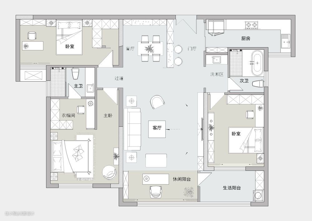 平面设计增加了门厅区域,附带鞋柜和吧台功能,阳台一分为二又可互相连通,充分利用空间,阳台部分抬高做休闲书房,营造闲适的氛围;餐厅旁边的卧室,开间很大,所以还做了一个衣帽间出来;主卫改变了门洞方向,改成正对着床,为了避免风水上的不好,所以做了个衣帽间出来,作为遮挡,衣帽间里面还做了化妆桌。