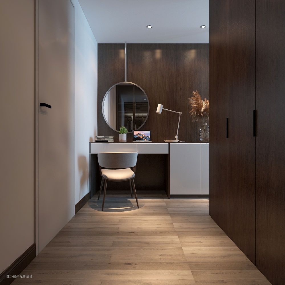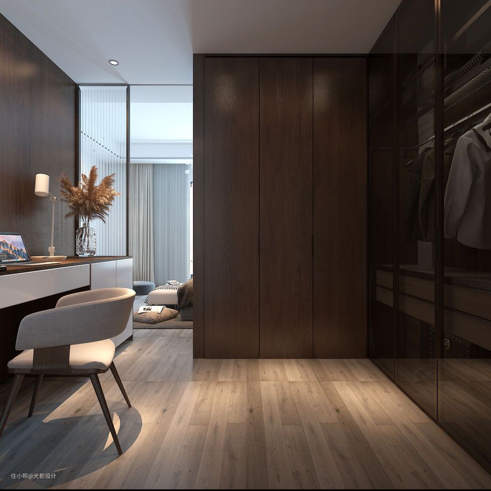 衣帽间兼具多种功能,隔开主卧与主卫之间,避免风水问题,增加储物功能,超长的桌面作为梳妆台,实用美观;衣柜柜门采用玻璃材质,这样满足了女业主的需求,有种橱窗的感觉,照片的角度看玻璃柜门不是太清晰,现场感觉非常有质感,比照片上要好看多了。