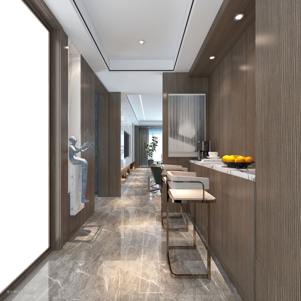原始结构无门厅,增加的门厅区域附带吧台功能,作为临时早餐就餐区域,也给门厅区域营造温馨的氛围。木饰面的设计,加上无拉手的设计,整体又高级,吧台上面做了两个射灯,照射下来能提升吧台用餐的氛围。