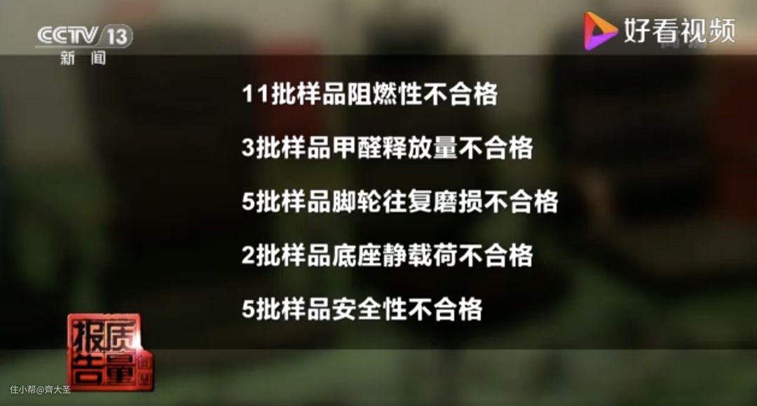 国家家具及室内环境质量监督检验中心曾抽查了11个省市90家企业生产的90批次办公椅产品。其中21批次产品不合格,不合格产品当中,办公转椅占了绝大多数,批次不合格发现率为23.3%。21批次不合格办公椅中有17批次都是转椅。