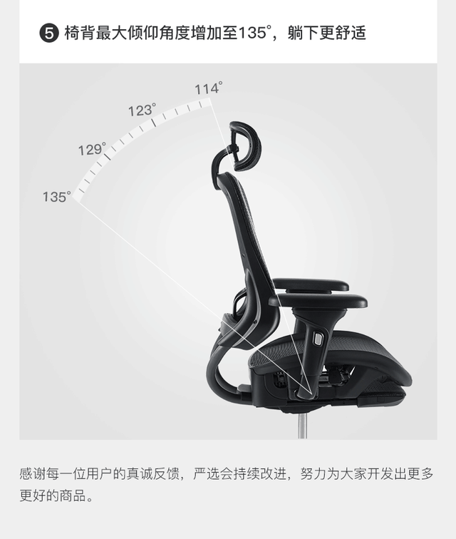 椅背后倾的功能主要是为了休息时使用,不过后仰的倾斜度不要一味追求大,130度左右就有躺的感觉、可以休息了,过度后仰会有椅子不稳定的隐患,不要挑大角度后仰的椅子。这款工学椅的后仰最大角度设计为135°,躺下更舒适。
