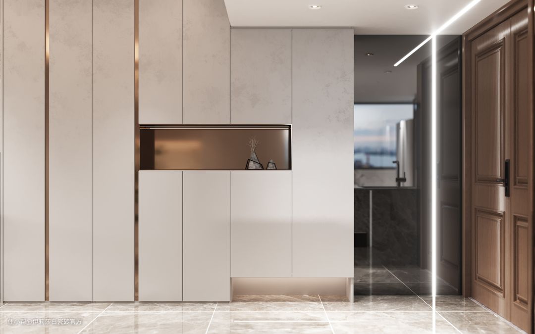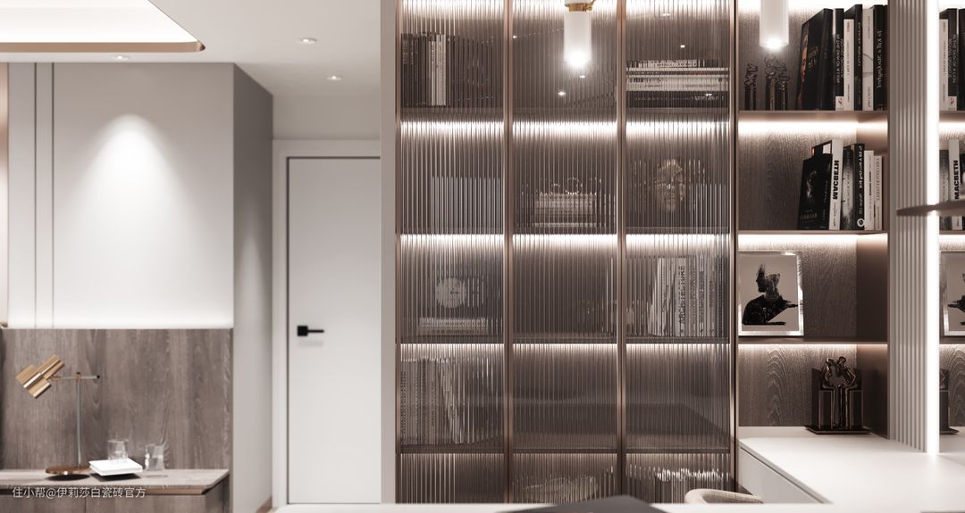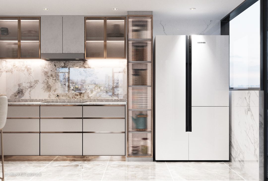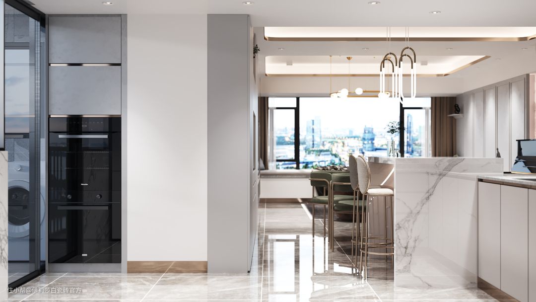 厨房烹饪区墙面选用了伊莉莎白连纹大板“云貂”,两片横向连纹无缝铺贴,简直不要太完美;其他区域墙面则选用了经典款“鱼肚白”系列,砖身竖贴更显修长,超白亮光釉面,轻盈优雅的砖纹,用极简白色彩打造最舒适清爽的厨房环境。